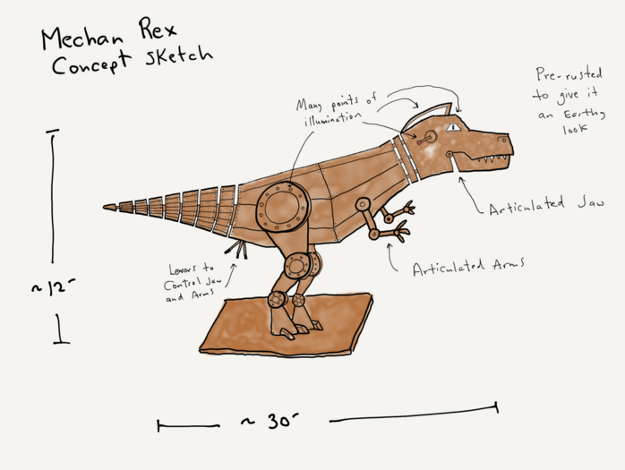Mechan Rex is a life-sized* T-Rex robot created in the same style as all of our other Mechan robots (see below.) This metal creature will be about 12' tall and 30' long and will feature articulated tiny arms and a chomping jaw. These articulations will be interactive via a control levers that anyone can activate to make it come to life. When the jaw fully opens it will let out a magnificent roar. The T-Rex will be illuminated in various ways - the rivets, the eyes, various antenna, a heart chamber, and maybe even a mohawk. Though not intended to be a climbable art installation, it will be engineered to handle the weight of plenty of people. It will be welded to a large metal base that will keep it from tipping over. For those looking for even more interaction, the T-Rex will feature strange alien text that can be translated via a decoder. The Rex will be pre-rusted to give it an Earthy look. The above drawing is just a concept. The exact design will be different than this drawing but this gives you a good idea of what it will look like.