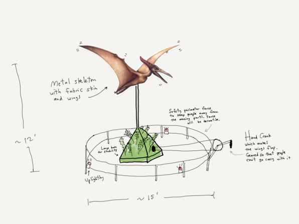 The Flying Pterodactyl is just that, an almost life-sized pterodactyl in a flying position that is an interactive art installation. The pterodactyl sits high on a rod that is connected to a large base that not only makes the creature stable, but also houses the gearing components that make the wings flap. The gearing is attached to a chain that leads out to a hand crank that allows anyone to walk up and make the creature come to life. The crank will be geared so that people won't be able to go crazy with it. The entire interactive art installation is surrounded by a decorative fence (it will look like plants or something that just screams "Jurassic") that keeps people a safe distance away from the moving parts. The base will be painted and decorated with large ferns to make it look like it's from the same time period.